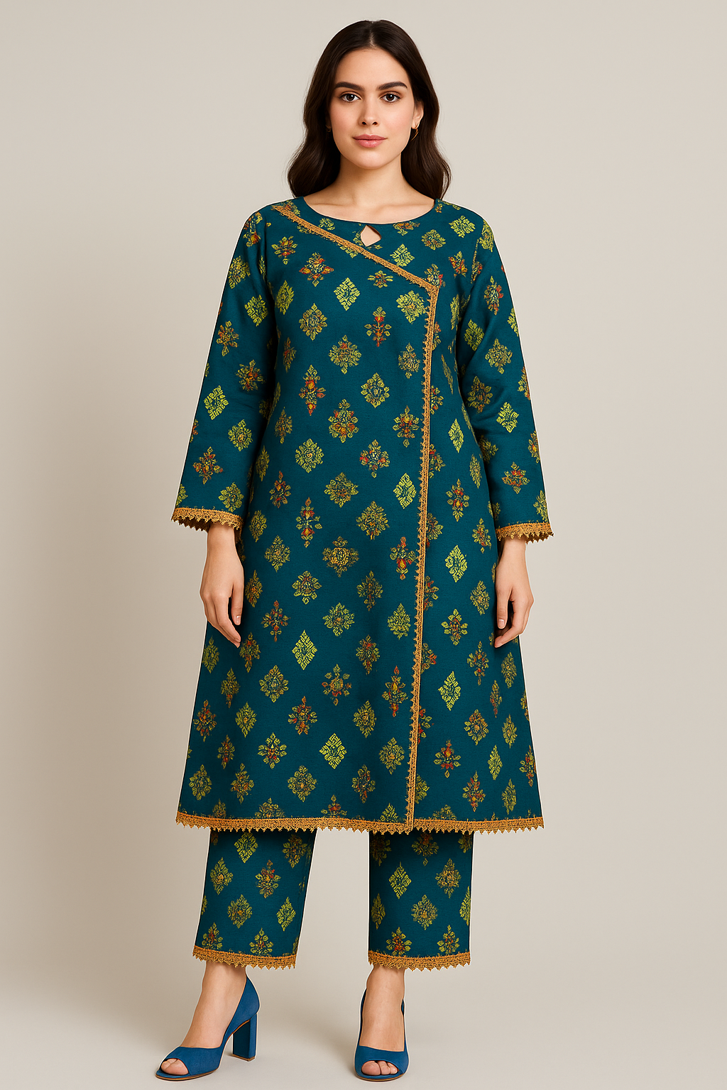 Elevate everyday elegance with our two-piece self-printed Angrakha set, crafted in premium quality, breathable lawn.
