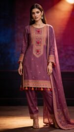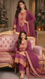 • Embroidered Shirt: Deep plum base with ornate festive embroidery and