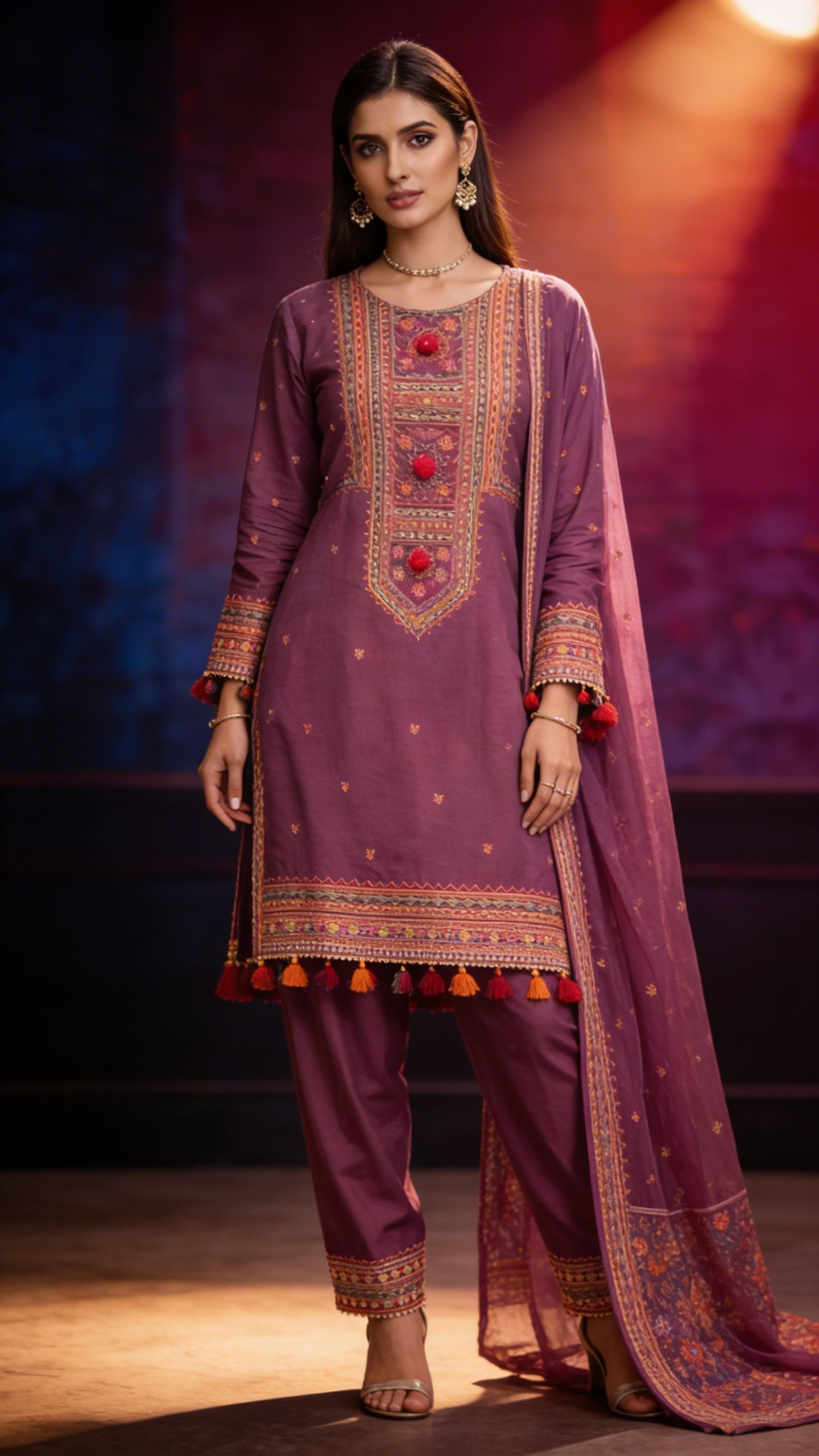 Elongated neckline embroidery, multicolor tassel accents, intricate border finishes, festive