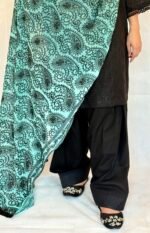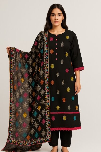 This all-black 3-piece set features delicate Chikankari embroidery on a breathable high quality lawn base, paired with a soft chiffon dupatta and tailored trousers for an amazing look.