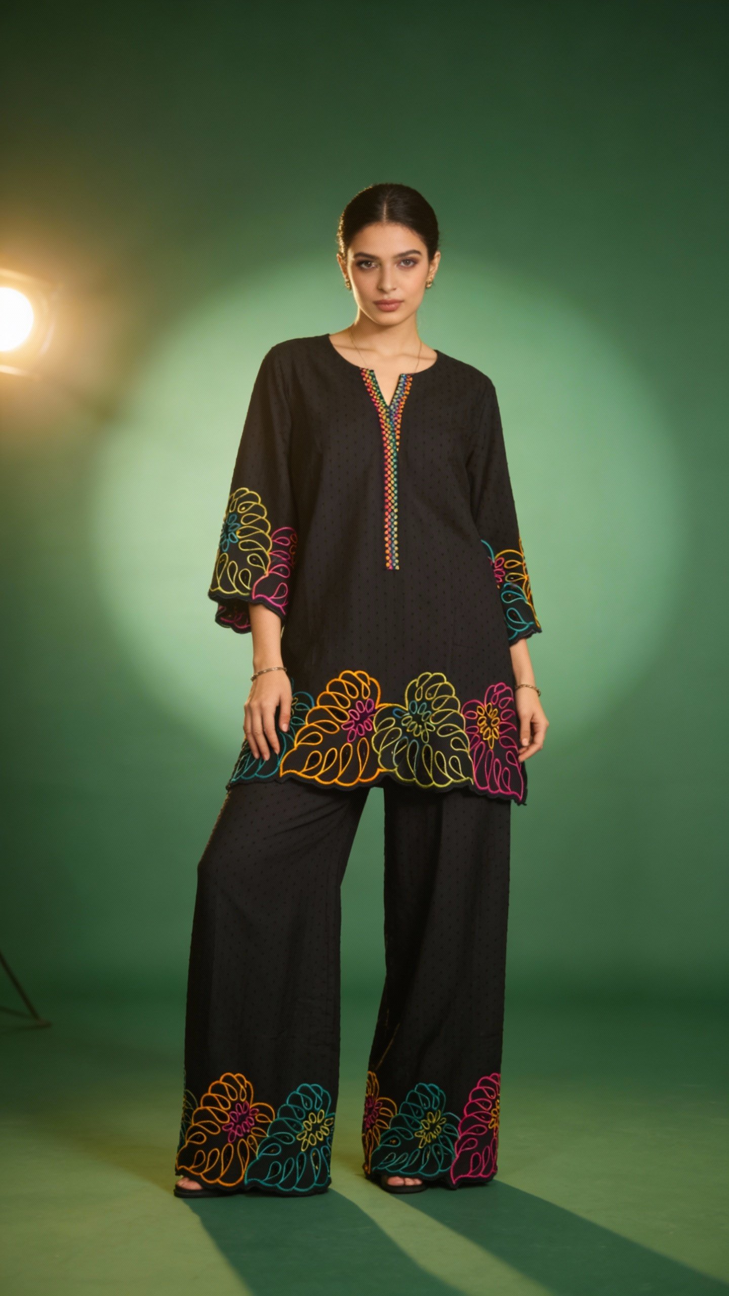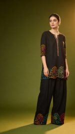 Bold and modern, this black co-ord set features vibrant multicolor embroidery against a sleek