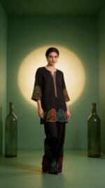 • Embroidered Shirt: Jet black base with multicolor neckline and hem embroidery.