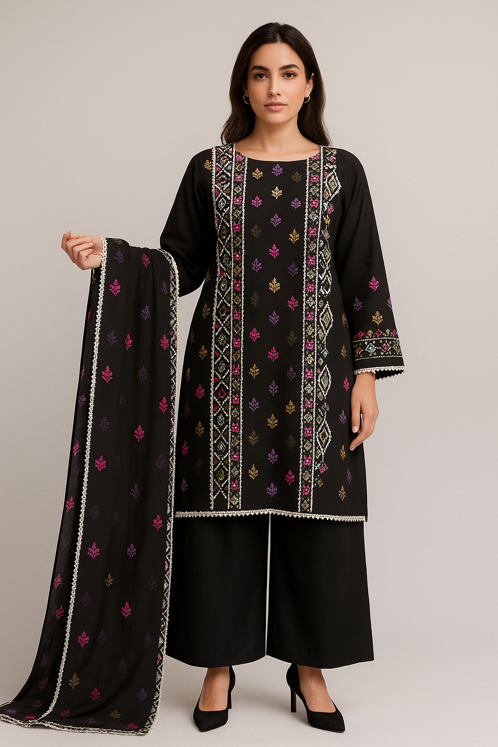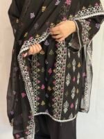 From our Premium Collection, the Black Luxe 3-piece suit features vibrant multi-color hand embroidery on a classic black shirt and flowy chiffon dupatta a perfect blend of tradition and elevated charm.