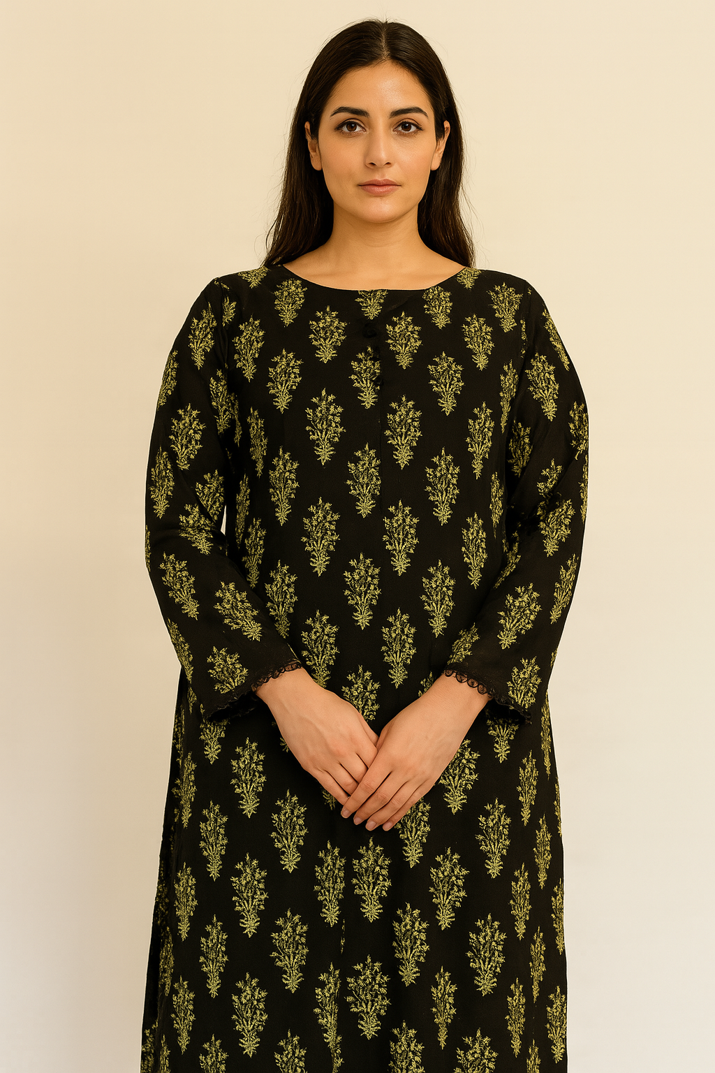 A wardrobe essential with a bold twist with this black kurta features subtle yet striking prints, perfect for effortless everyday elegance.