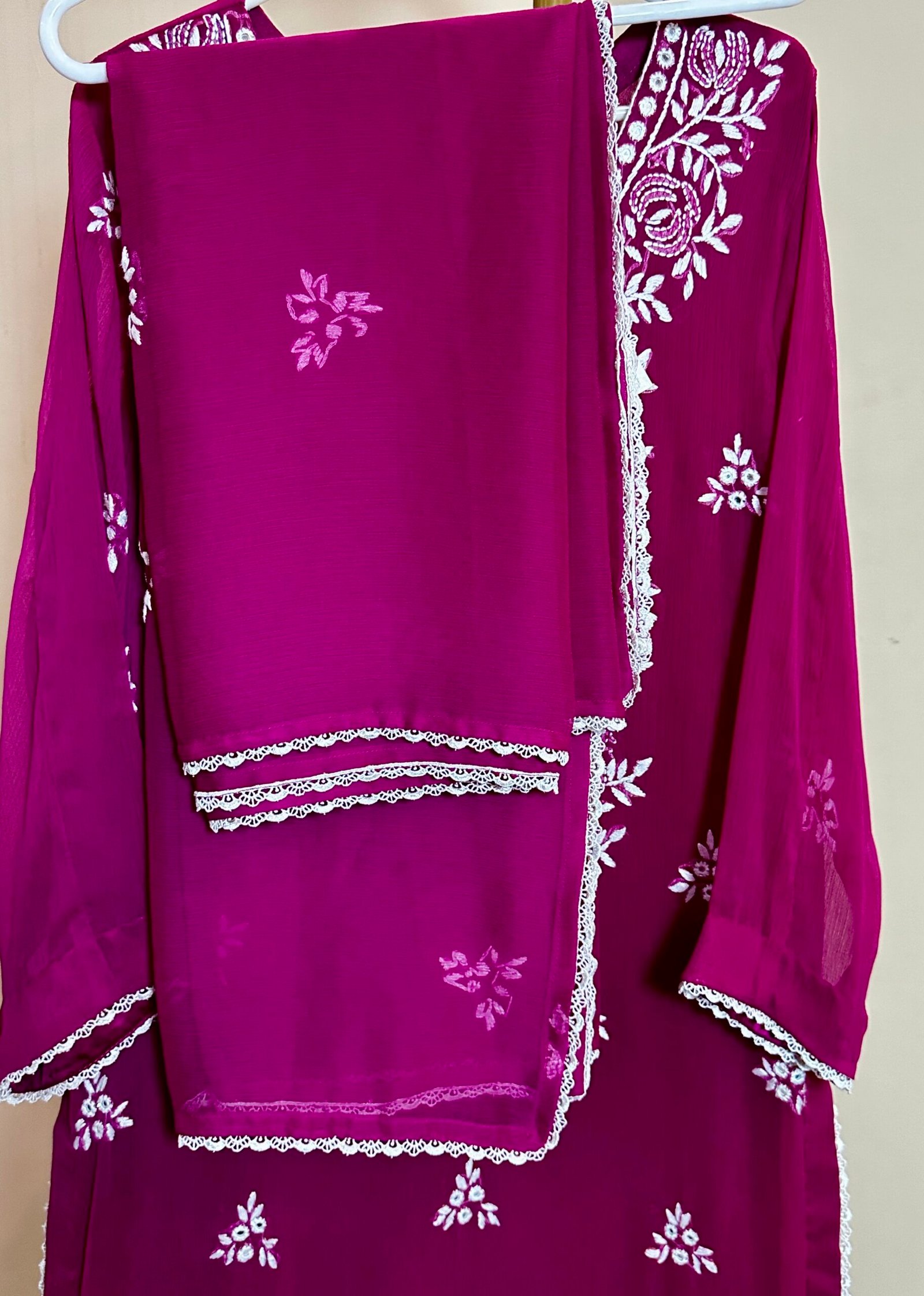 Two-piece chiffon suit, beautifully adorned with delicate hand embroidery on the shirt and dupatta crafted to bring elegance and grace to every occasion.