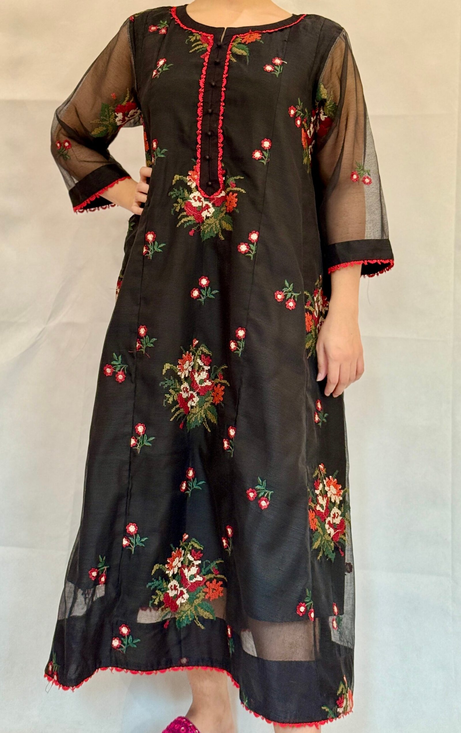 Delicate khadi net frock featuring exquisite multi-thread hand embroidery.